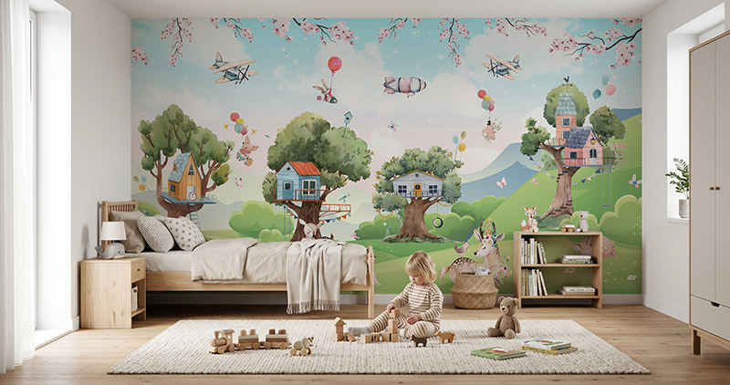 Trzeci kierunek to fototapety z domkami - na drzewach, w dolinach, między wzgórzami. Działają inaczej niż jednorożce: angażują dziecko w wymyślanie historii. Mamy w katalogu wzór z kolorowymi domkami na drzewach, balonami i samolotami w tle - i to jest ten typ tapety, którą trzylatka pokazuje każdej cioci, która przyjdzie w odwiedziny.