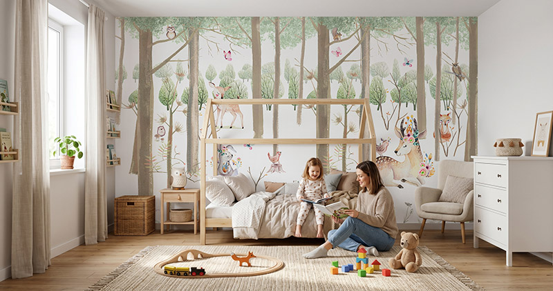 W tym wieku działa scena. Nie pojedynczy element, tylko mały świat: las z zającem chowającym się za drzewem, łąka z motylami, domki rozsiane po wzgórzu. Mama 3-latki, która zamawiała u nas niedawno fototapetę z domkami na drzewach, opowiadała, że córka codziennie wymyśla, kto mieszka w którym domku - i każdego dnia inaczej. To jest dokładnie ten mechanizm, o który chodzi.